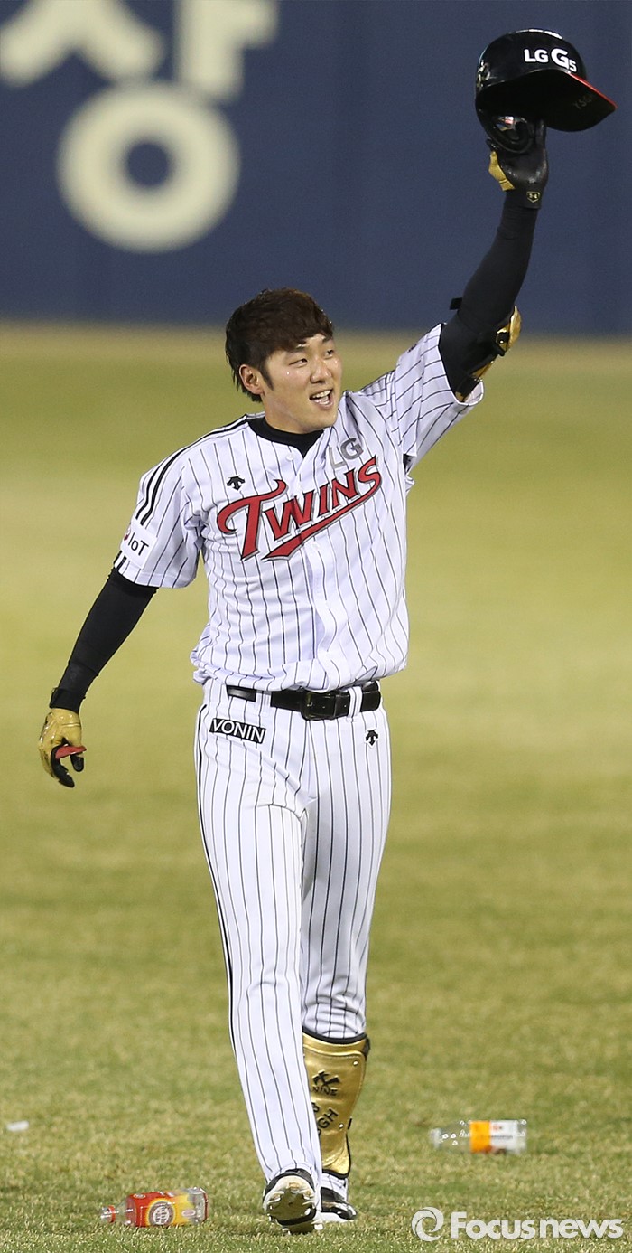 (서울=포커스뉴스) 1일 서울 잠실구장에서 열린 2016프로야구 개막전 한화-LG 경기 연장 12회말 1사 2루에서 좌익수를 넘기는 역전 2루타를 날린 LG 양석환이 헬맷을 들고 관중의 환호에 답하고 있다.