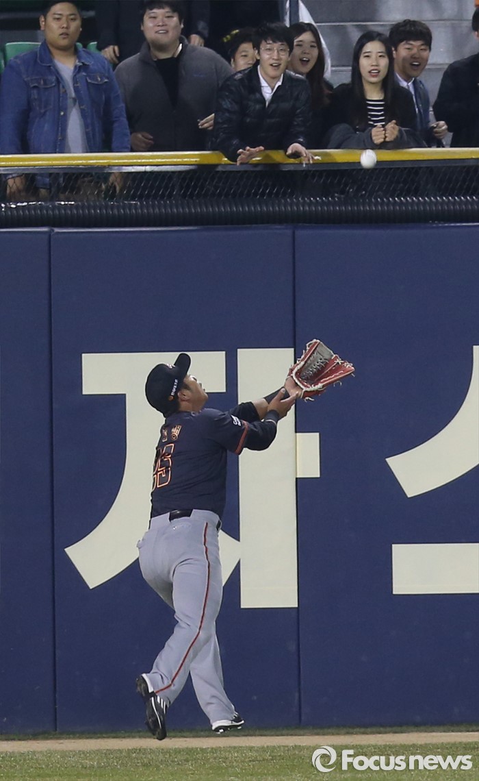 (서울=포커스뉴스) 1일 서울 잠실구장에서 열린 2016프로야구 개막전 한화-LG 경기 연장 12회말 1사 2루에서 한화 좌익수 최진행이 LG 양석환의 타구를 잡으려 달려가고 있다.