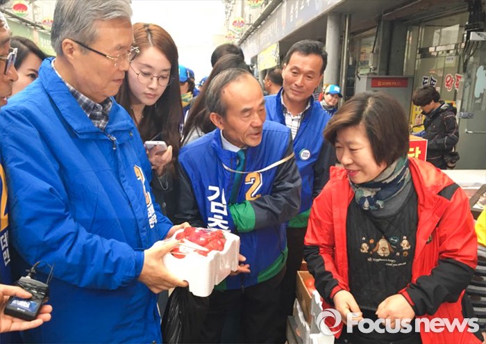 (김제=포커스뉴스) 2일 오전 전북 김제 전통시장을 방문한 김종인(왼쪽) 더불어민주당 비대위 대표 겸 선대위원장이 김춘진 김제·부안 후보 유세에 참석해 상인들과 인사하며 지지를 호소하고 있다.