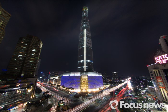 (서울=포커스뉴스) 세계 자폐인의 날인 2일 오후 서울 송파구 롯데월드타워의 건물 외벽에 파란색 LED 조명이 빛을 밝히고 있다.
