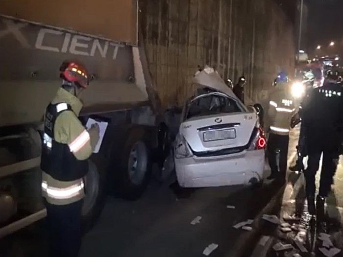 (서울=포커스뉴스) 3일 오전 3시 53분쯤 서울 동작구 한강철교 밑 노들길에서 강남 방향으로 달리던 SM5 승용차가 갓길에 주차된 덤프트럭을 추돌하는 사고가 일어났다.