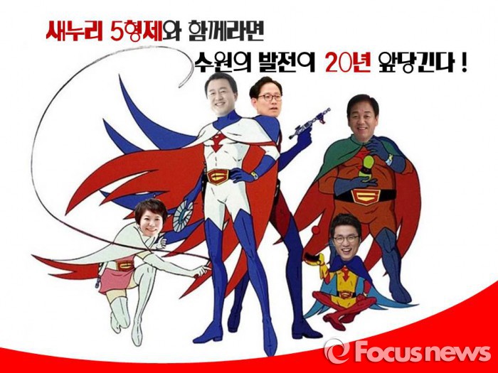 (서울=포커스뉴스) 수원 갑·을·병·정·무 지역구 후보로 출마하는 새누리당 후보 5인이 인기리에 방송됐던 만화 '독수리 5형제'를 패러디해 눈길을 끌고 있다.