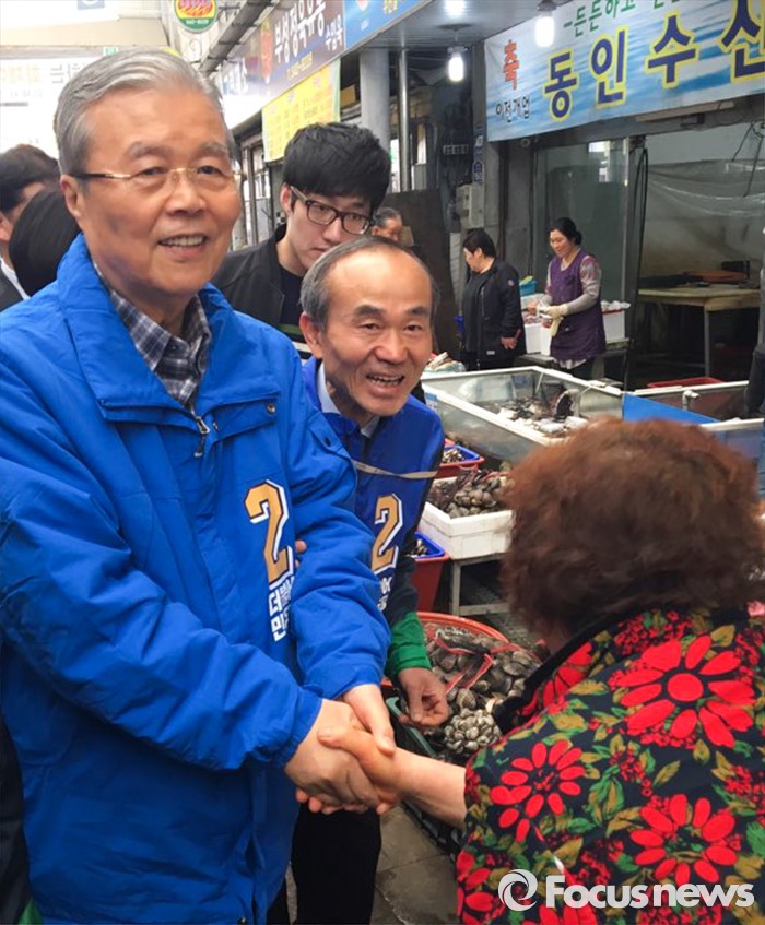 김 대표는 "그동안 어려웠던 후보들이 최근 약진하는 모습을 보인다"면서 "선거일까지 어느 정도 성과를 거둘 수 있을 것"이라고 덧붙였다.2일 오전 전북 김제 전통시장을 방문한 김종인(왼쪽) 더불어민주당 비대위 대표 겸 선대위원장이 김춘진 김제·부안 후보 유세에 참석해 상인들과 인사하며 지지를 호소하고 있다. 2016.04.02 문장원 기자
