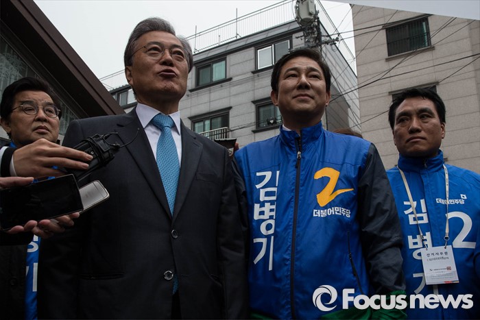 (서울=포커스뉴스) 선거운동이 시작되고 첫 주말을 맞은 3일 오전 문재인 전 더불어민주당 대표가 서울 동작구 신대방성당에서 김병기 더불어민주당 동작갑 후보를 찾아 합동유세를 하고 있다.
