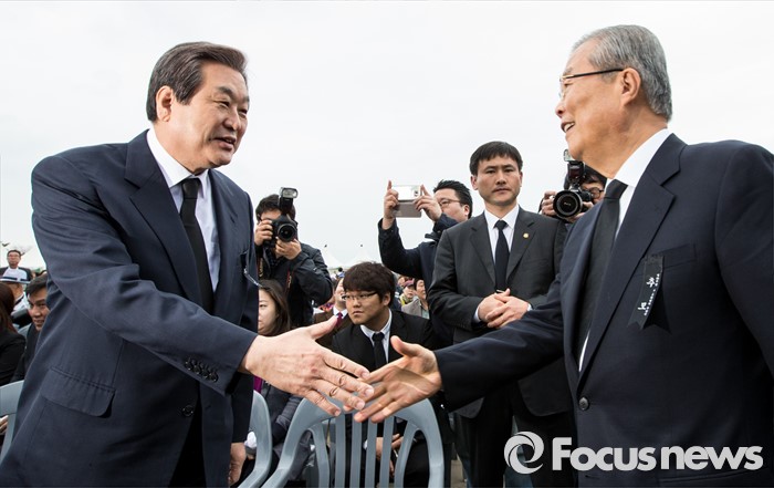 (제주=포커스뉴스) 3일 오전 제주 4ㆍ3 평화공원에서 열린 제68주년 4ㆍ3희생자 추념식에 참석한 김무성(왼쪽) 새누리당 대표와 김종인 더불어민주당 비상대책위원회 대표가 악수하고 있다.