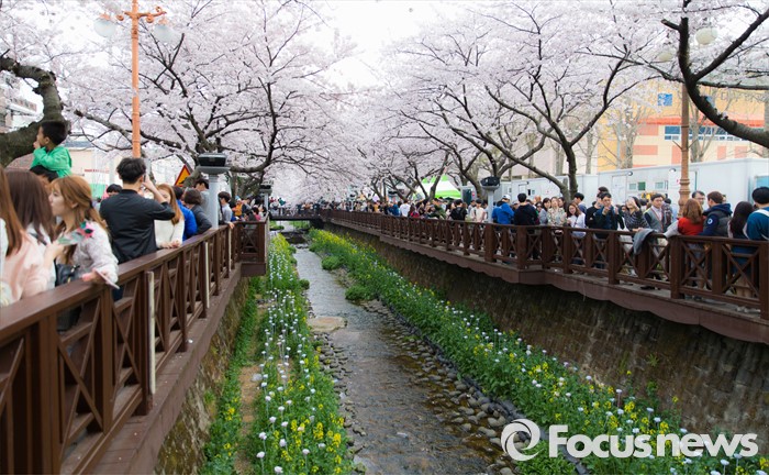 (창원=포커스뉴스) 2일 오후 경남 창원시 진해구 여좌천을 찾은 관광객들이 만개한 벚꽃을 보며 즐거운 시간을 보내고 있다.