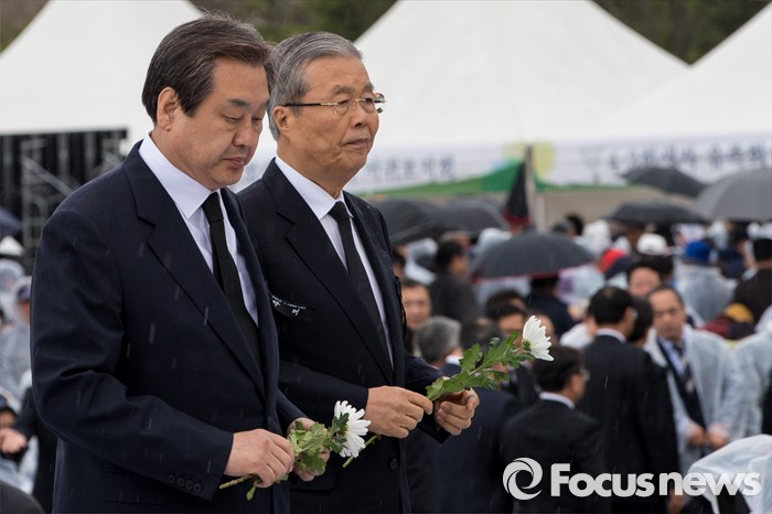 (제주=포커스뉴스) 3일 오전 제주 4ㆍ3 평화공원에서 열린 제68주년 4ㆍ3희생자 추념식에 참석한 김무성(왼쪽) 새누리당 대표가 김종인 더불어민주당 비상대책위원회 대표가 추모단으로 향하고 있다.