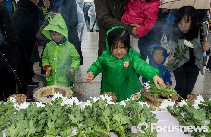 (제주=포커스뉴스) 3일 오전 제주 4ㆍ3 평화공원에서 열린 제68주년 4ㆍ3희생자 추념식에 참석한 어린이들이 헌화하고 있다.