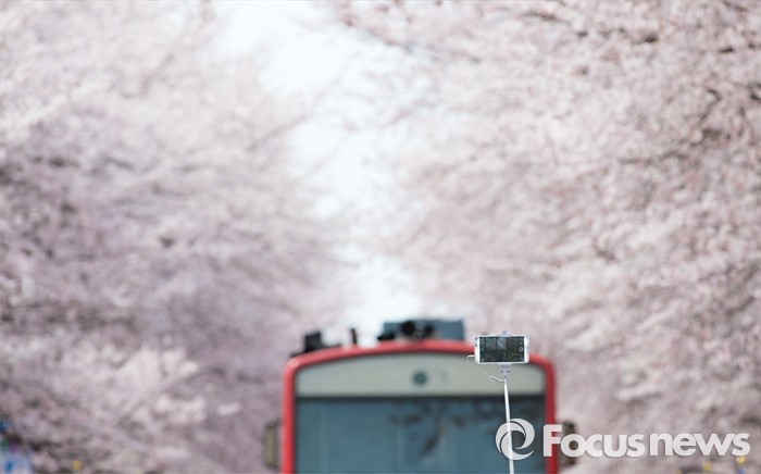 (창원=포커스뉴스) 2일 오후 경남 창원시 진해구 경화역을 찾은 관광객들이 만개한 벚꽃을 보며 즐거운 시간을 보내고 있다.