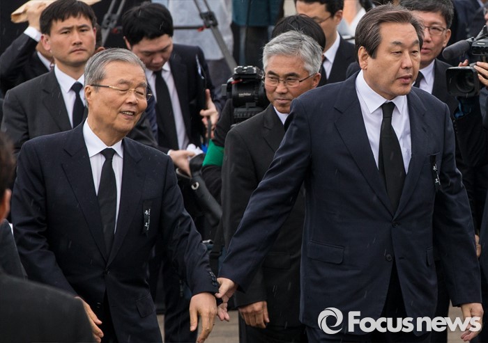 (제주=포커스뉴스) 3일 오전 제주 4ㆍ3 평화공원에서 열린 제68주년 4ㆍ3희생자 추념식에 참석한 김무성(오른쪽) 새누리당 대표가 김종인 더불어민주당 비상대책위원회 대표의 소매를 잡고 추모단으로 향하고 있다.