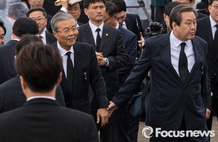 (제주=포커스뉴스) 3일 오전 제주 4ㆍ3 평화공원에서 열린 제68주년 4ㆍ3희생자 추념식에 참석한 김무성(오른쪽) 새누리당 대표가 김종인 더불어민주당 비상대책위원회 대표의 소매를 잡고 추모단으로 향하고 있다.