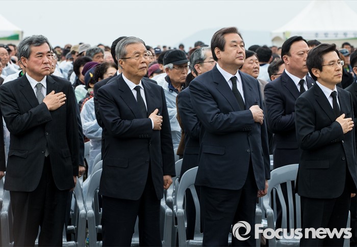 (제주=포커스뉴스) 3일 오전 제주 4ㆍ3 평화공원에서 열린 제68주년 4ㆍ3희생자 추념식에 참석한 이상돈(왼쪽부터) 국민의당 공동선대위원장,김종인 더불어민주당 비상대책위원회 대표, 김무성 새누리당 대표, 황교안 국무총리가 국민의례를 하고 있다.
