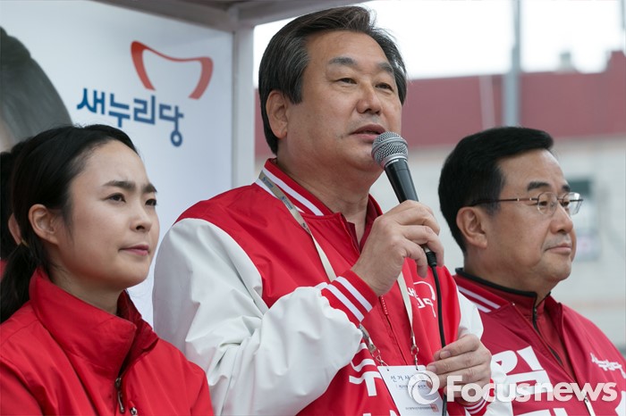 (부산=포커스뉴스) 김무성(가운데) 새누리당 대표가 3일 오후 부산광역시 사상구 광장로의 한 대형마트 앞에서 손수조(왼쪽) 사상구 후보 지원유세를 하고 있다.