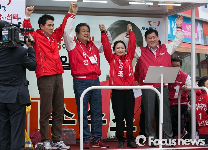 (부산=포커스뉴스) 김무성(왼쪽 두번째) 새누리당 대표가 3일 오후 부산광역시 사상구 광장로의 한 대형마트 앞에서 손수조 사상구 후보 지원유세에 참석해, 손 후보의 손을 들고 있다. 오른쪽부터 최경환 전 경제부총리, 손 후보, 김 대표, 김태호 최고위원.