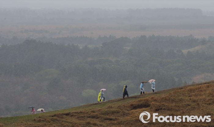 (제주=포커스뉴스) 3일 오후 제주 용눈이오름을 찾은 관광객들이 제주의 풍광을 즐기고 있다.