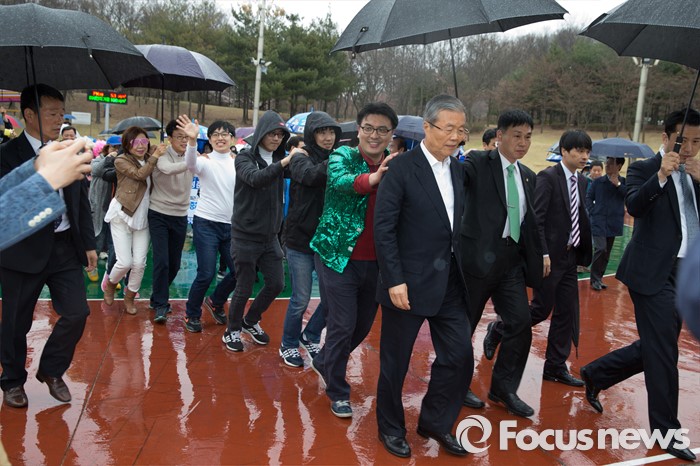 (서울=포커스뉴스) 3일 오후 서울 강서구 방화근린공원 일대에서 김종인 더불어민주당 비대위 대표 겸 선대위원장이 진성준 강서을 후보와 함께 유세를 하고 있다.