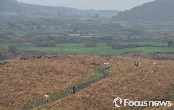 (제주=포커스뉴스) 3일 오후 제주 용눈이오름을 찾은 관광객들이 제주의 풍광을 즐기고 있다.
