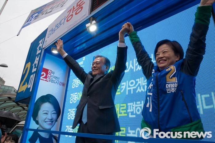 (서울=포커스뉴스) 선거운동이 시작되고 첫 주말을 맞은 3일 오후 문재인 전 더불어민주당 대표가 서울 강동구 암사시장에서 진선미 더불어민주당 강동구갑 후보와 합동유세를 하고 있다.