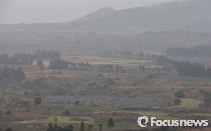 (제주=포커스뉴스) 3일 오후 제주 용눈이오름에서 바라본 제주의 모습이 안개 속에 싸여 있다.
