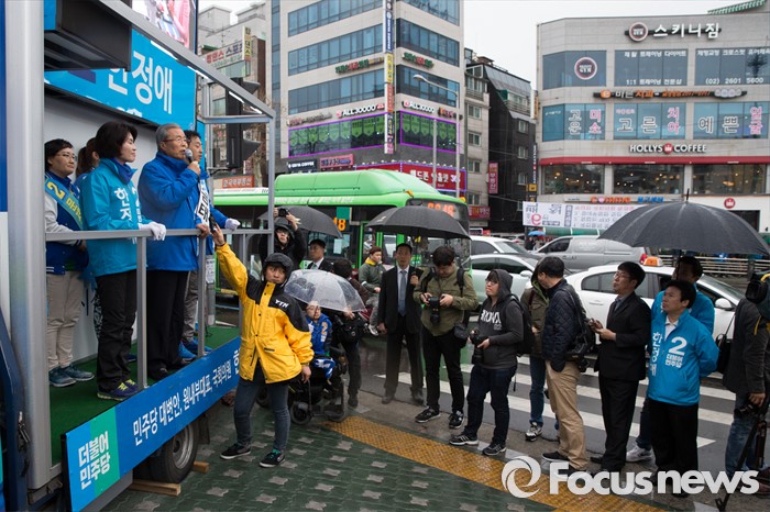 (서울=포커스뉴스) 3일 오후 서울 강서구 화곡역 사거리에서 김종인 더불어민주당 비대위 대표 겸 선대위원장이 강서갑 금태섭, 강서병 한정애 후보와 함께 유세를 하고 있다.