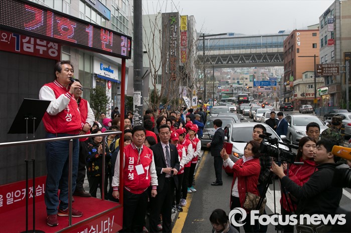 (부산=포커스뉴스) 부산광역시 중구영도구에 출마한 김무성 새누리당 대표가 3일 오후 부산시 영도구 남항시장 입구에서 유세를 하고 있다.