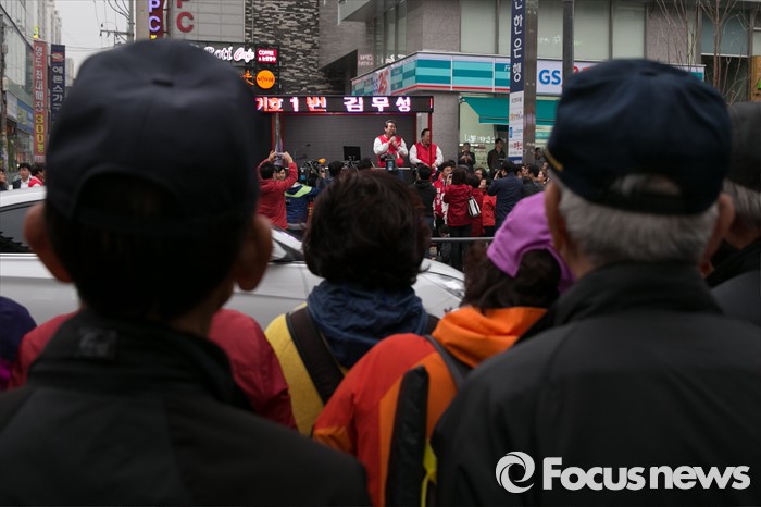 (부산=포커스뉴스) 부산광역시 중구영도구에 출마한 김무성 새누리당 대표가 3일 오후 부산시 영도구 남항시장 입구에서 유세를 하고 있다.