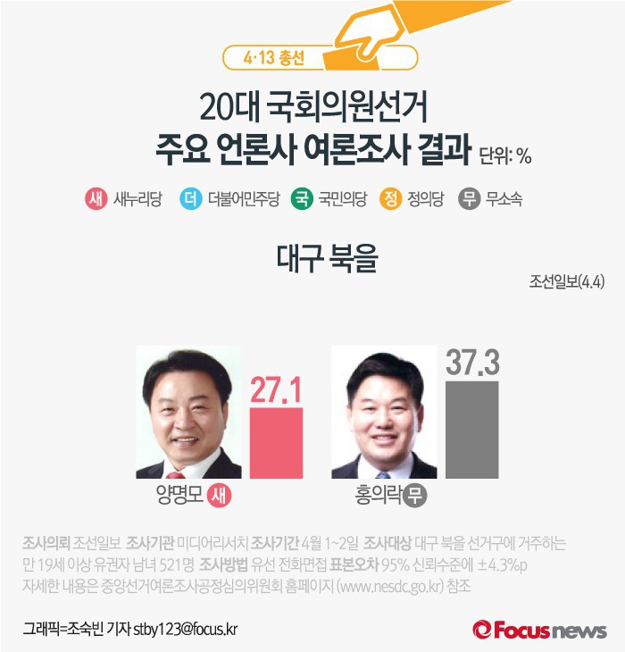 (서울=포커스뉴스) 조선일보가 미디어리서치에 의뢰해 4월 1~2일 동안 대구 북을 선거구에 거주하는 유권자 521명을 대상으로 여론조사를 실시한 결과, 무소속 홍의락 후보의 지지율은 37.3%, 새누리당 양명모 후보의 지지율은 27.1%를 기록했다.