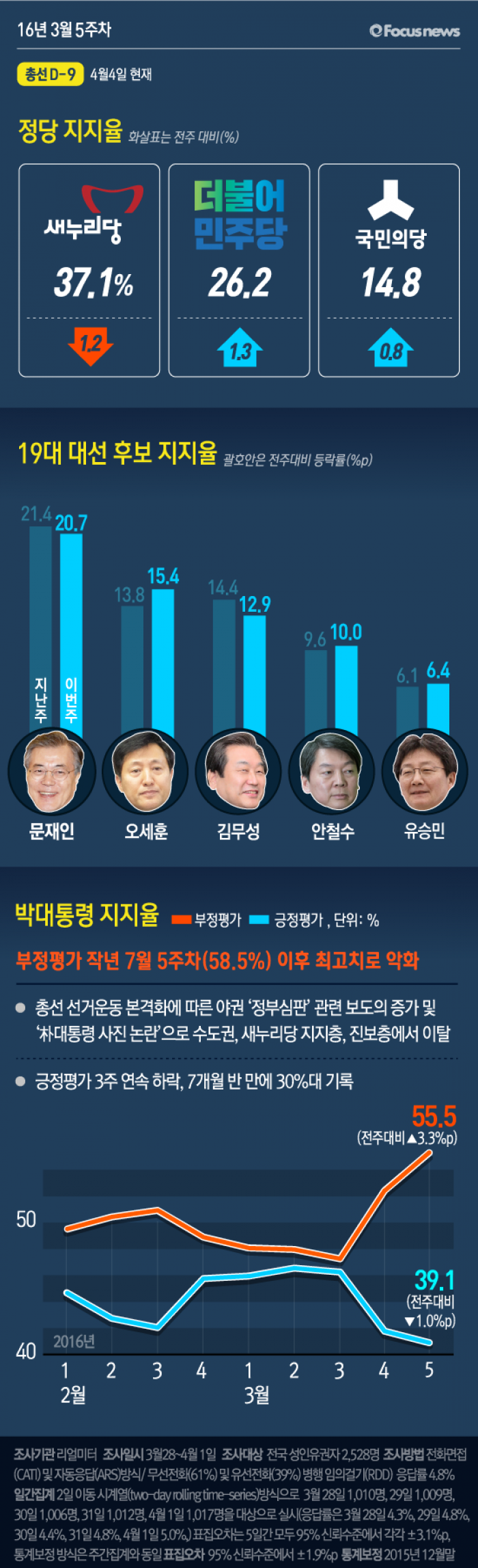 이번 주간집계는 2016년 3월 28일부터 4월 1일까지 5일간 전국 19세 이상 유권자 2,528명을 대상으로 전화면접(CATI) 및 자동응답(ARS) 방식으로 무선전화(61%)와 유선전화(39%) 병행 임의걸기(RDD) 방법으로 조사했고, 응답률은 4.8%이다. 통계보정은 2015년 12월말 행정자치부 주민등록 인구통계 기준 성, 연령, 권역별 가중치 부여 방식으로 이루어졌고, 표집오차는 95% 신뢰수준에서 ±1.9%p이다. 일간집계는 ‘2일 이동 시계열(two-day rolling time-series)’ 방식으로 3월 28일 1,010명, 29일 1,009명, 30일 1,006명, 31일 1,012명, 4월 1일 1,017명을 대상으로 실시했고, 응답률은 3월 28일 4.3%, 29일 4.8%, 30일 4.4%, 31일 4.8%, 4월 1일 5.0%, 표집오차는 5일간 모두 95% 신뢰수준에서 각각 ±3.1%p이다. 일간집계의 통계보정 방식은 주간집계와 동일하다.
