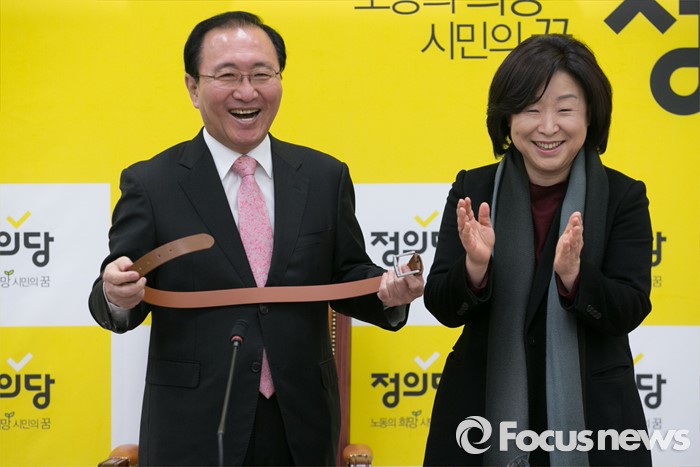 이번 여론조사는 1~2일 창원 성산 선거구에 거주하는 만 19세 이상 남녀 524명을 대상 유선전화면접 방식으로 진행됐다. 표본오차는 95% 신뢰수준에 ±4.3%포인트다. 자세한 내용은 중앙선거여론조사공정심의위원회 홈페이지(www.nesdc.go.kr)에서 찾아볼 수 있다.(서울=포커스뉴스) 4일 오전 서울 여의도 국회에서 열린 정의당 공동선대위원장 위촉식에 참석한 심상정(오른쪽) 상임대표가 노회찬 전 대표에게 위촉장을 전달한 뒤 벨트를 선물하고 있다. 2016.02.04 박동욱 기자