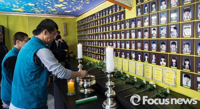 (서울=포커스뉴스) 4일 오전 서울 광화문광장에서 전국교직원노동조합 조합원들이 세월호 참사 2주기 공동수업 및 실천활동 선포 기자회견을 마친 후 세월호 광장 분향소에 헌화하고 있다.