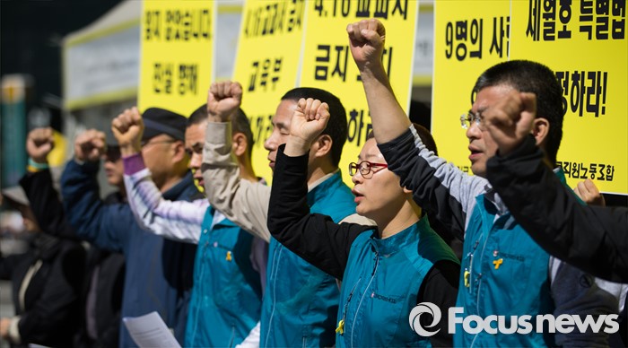 (서울=포커스뉴스) 4일 오전 서울 광화문광장에서 전국교직원노동조합 조합원들이 세월호 참사 2주기 공동수업 및 실천활동 선포 기자회견 중 교육부의 416교과서 금지 조치 철회 촉구하는 구호를 외치고 있다.