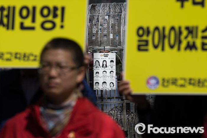 (서울=포커스뉴스) 4일 오전 서울 광화문광장에서 전국교직원노동조합 조합원들이 세월호 참사 2주기 공동수업 및 실천활동 선포 기자회견을 하고 있다.