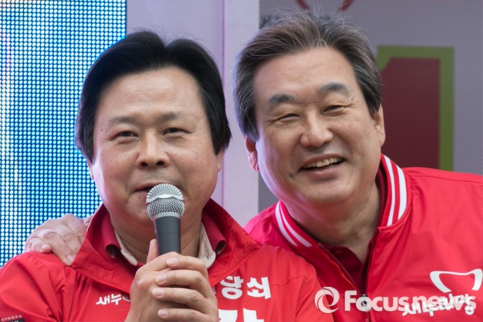 (창원=포커스뉴스) 김무성(오른쪽) 새누리당 대표가 4일 오전 경남 창원시 성산구 가음정시장 앞에서 강기윤(왼쪽) 창원시성산 후보 지원유세에 참석해, 강 후보와 얼굴을 가까이 대고 있다.
