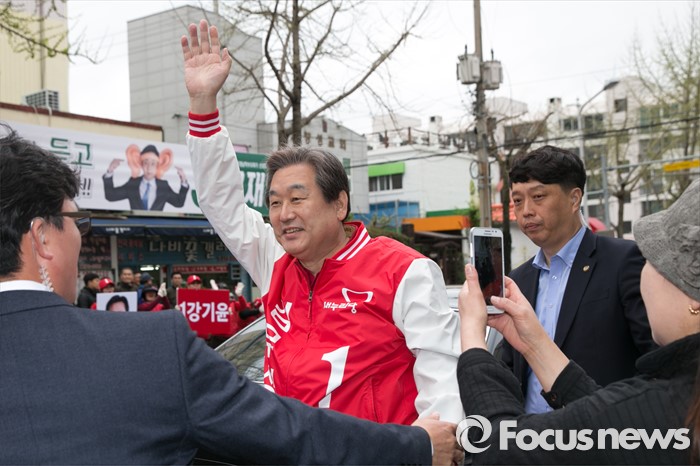 (창원=포커스뉴스) 김무성(오른쪽) 새누리당 대표가 4일 오전 경남 창원시 성산구 가음정시장 앞에서 강기윤 창원시성산 후보 지원유세에 참석해, 손을 흔들고 있다.