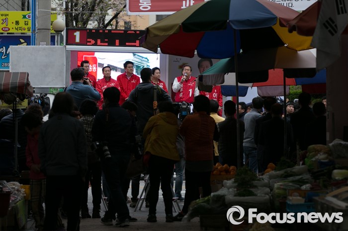 (창원=포커스뉴스) 김무성(오른쪽) 새누리당 대표가 4일 오전 경남 창원시 성산구 가음정시장 앞에서 강기윤(오른쪽 두번째) 창원시성산 후보 지원유세를 하고 있다.