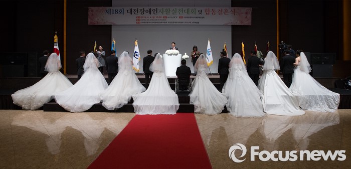 (대전=포커스뉴스) 4일 오전 대전 유성구 호텔ICC에서 열린 제18회 대전장애인자활실천대회 및 합동결혼식에서 신랑과 신부가 주례사를 듣고 있다.