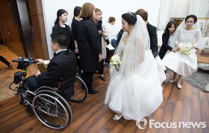 (대전=포커스뉴스) 4일 오전 대전 유성구 호텔ICC에서 열린 제18회 대전장애인자활실천대회 및 합동결혼식에서 신랑과 신부가 결혼식장으로 이동하고 있다.