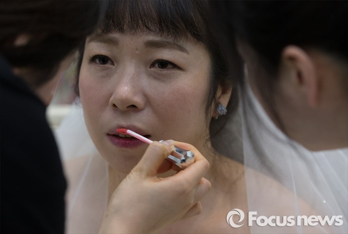 (대전=포커스뉴스) 4일 오전 대전 유성구 호텔ICC에서 열린 제18회 대전장애인자활실천대회 및 합동결혼식에서 신부가 메이크업을 받고 있다.