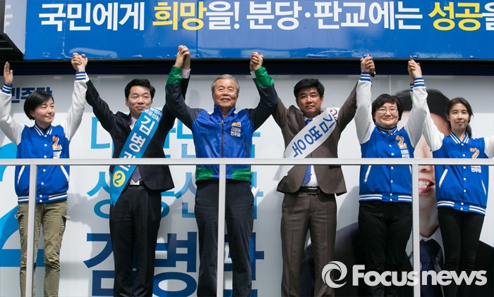 (성남=포커스뉴스) 4일 오후 경기도 서현역 인근 거리에서 열린 더불어민주당 성남 분당구 선거유세에 참석한 김종인 비대위 대표 겸 선대위원장과 후보들이 손을 들어 취재진을 향해 포즈를 취하고 있다. 왼쪽부터 제윤경 비례대표 후보, 김병관 분당갑 후보, 김 대표, 김병욱 분당을 후보, 문미옥, 박경미 비례대표 후보.