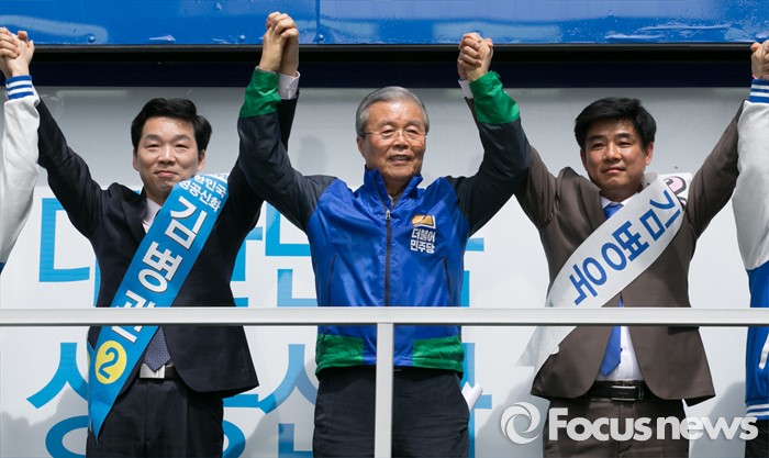 (성남=포커스뉴스) 4일 오후 경기도 서현역 인근 거리에서 열린 더불어민주당 성남 분당구 선거유세에 참석한 김종인 비대위 대표 겸 선대위원장과 후보들이 손을 들어 취재진을 향해 포즈를 취하고 있다. 왼쪽부터 김병관 분당갑 후보, 김 대표, 김병욱 분당을 후보.