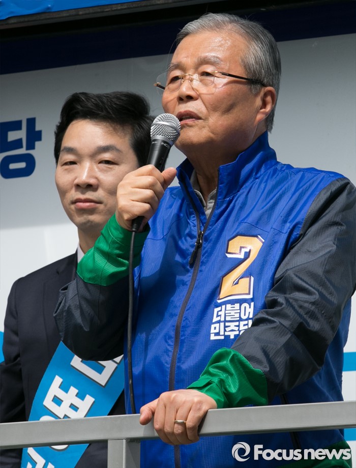 (성남=포커스뉴스) 4일 오후 경기도 서현역 인근 거리에서 열린 더불어민주당 성남 분당구 선거유세에 참석한 김종인 비대위 대표 겸 선대위원장이 지지를 호소하고 있다. 왼쪽은 김병관 분당갑 후보.
