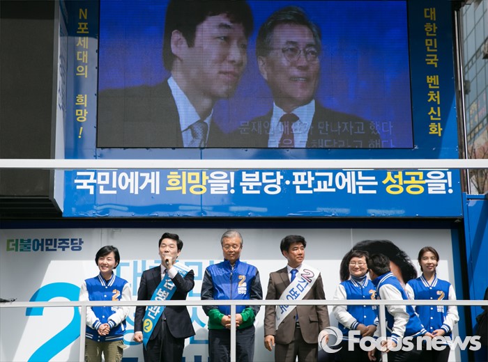 (성남=포커스뉴스) 4일 오후 경기도 서현역 인근 거리에서 열린 더불어민주당 성남 분당구 선거유세에 참석한 김병관(왼쪽 두번째) 분당갑 후보가 지지를 호소하고 있다.