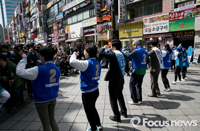 (성남=포커스뉴스) 4일 오후 경기도 서현역 인근 거리에서 열린 더불어민주당 성남 분당구 선거유세에 참석한 김종인 비대위 대표 겸 선대위원장과 김병관 분당갑, 김병욱 분당을 후보, 비례대표 후보들이 로고송에 맞춰 율동을 선보이고 있다.
