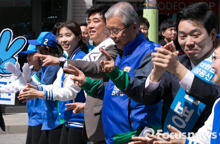 (성남=포커스뉴스) 4일 오후 경기도 서현역 인근 거리에서 열린 더불어민주당 성남 분당구 선거유세에 참석한 김종인 비대위 대표 겸 선대위원장과 김병관 분당갑, 김병욱 분당을 후보 등 비례대표 후보들이 로고송에 맞춰 율동을 선보이고 있다.