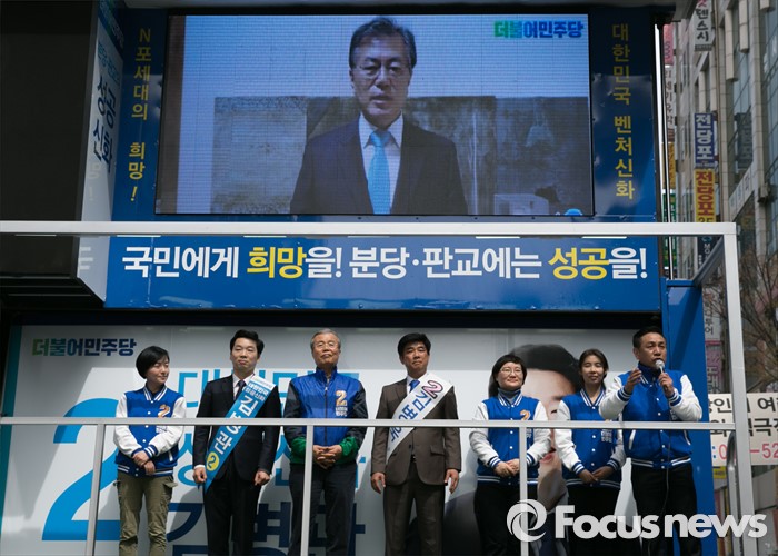 (성남=포커스뉴스) 4일 오후 경기도 서현역 인근 거리에서 열린 더불어민주당 성남 분당구 선거유세에 참석한 김종인 비대위 대표 겸 선대위원장과 김병관 분당갑, 김병욱 분당을 후보, 비례대표 후보들이 지지를 호소하고 있다.