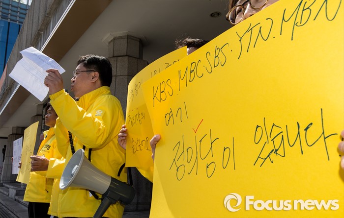 (서울=포커스뉴스) 4일 오후 서울 종로구 세종문화회관 앞에서 열린 '정의당, 방송기자클럽 초청 토론회 배제에 대한 항의 긴급기자회견'에 참석한 이혁재 사무총장이 규탄발언을 하고 있다.