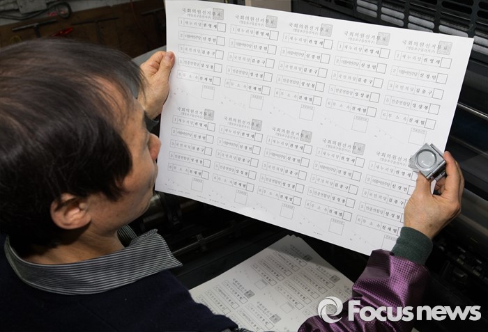 (서울=포커스뉴스) 제20대 국회의원 선거를 9일 앞둔 4일 오후 서울 영등포구 한 인쇄소에서 한 직원이 투표용지 교열작업을 하고 있다.