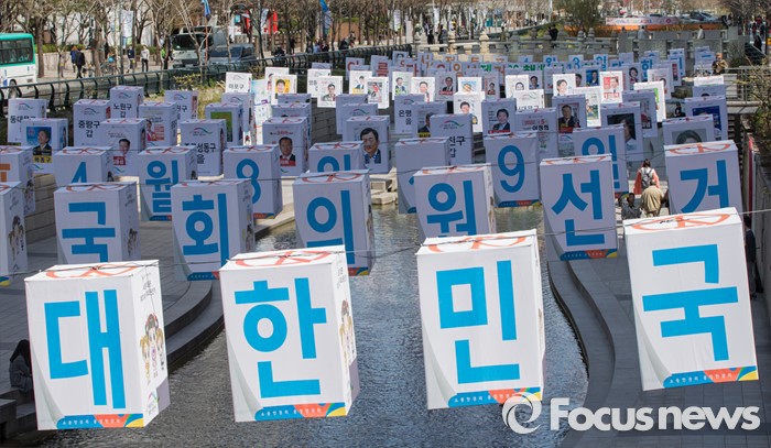 (서울=포커스뉴스) 4일 오후 서울 청계천 모전교에서 광통교 사이에 4.13 제20대 국회의원선거를 알리는 조형물이 설치돼 있다.