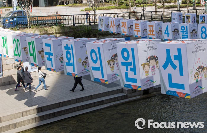 (서울=포커스뉴스) 4일 오후 서울 청계천 모전교에서 광통교 사이에 4.13 제20대 국회의원선거를 알리는 조형물이 설치돼 있다.