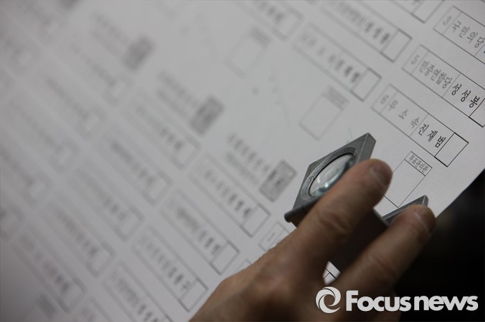 (서울=포커스뉴스) 제20대 국회의원 선거를 9일 앞둔 4일 오후 서울 영등포구 한 인쇄소에서 직원이 투표용지 교열작업을 하고 있다.